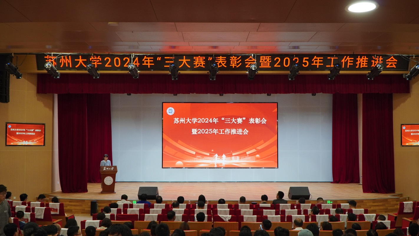 為總結學科競賽經驗、表彰先進典型,進一步深化我校競賽育人工作,5月16日下午,蘇州大學2024年“三大賽”表彰會暨2025年工作推進會在獨墅湖校區文體中心舉行。校黨委常委、副校長姚建林,相關職能部門及直屬單位負責人,各學院(部)競賽工作領導小組成員,創新創業教育實踐基地代表,獲獎團隊代表及指導老師,各學院學生代表齊聚現場,共商雙創教育發展新路徑。